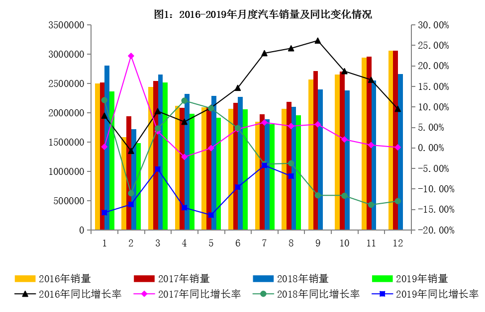 2019年8月,汽车产销同比继续下降,产量降幅继续收窄,销量降幅有所扩大。